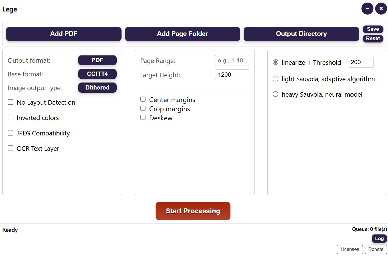The application supports multiple advanced output formats as well as extensively tested binarization methods. Including one winner of the International Document Image Binarization Contest.